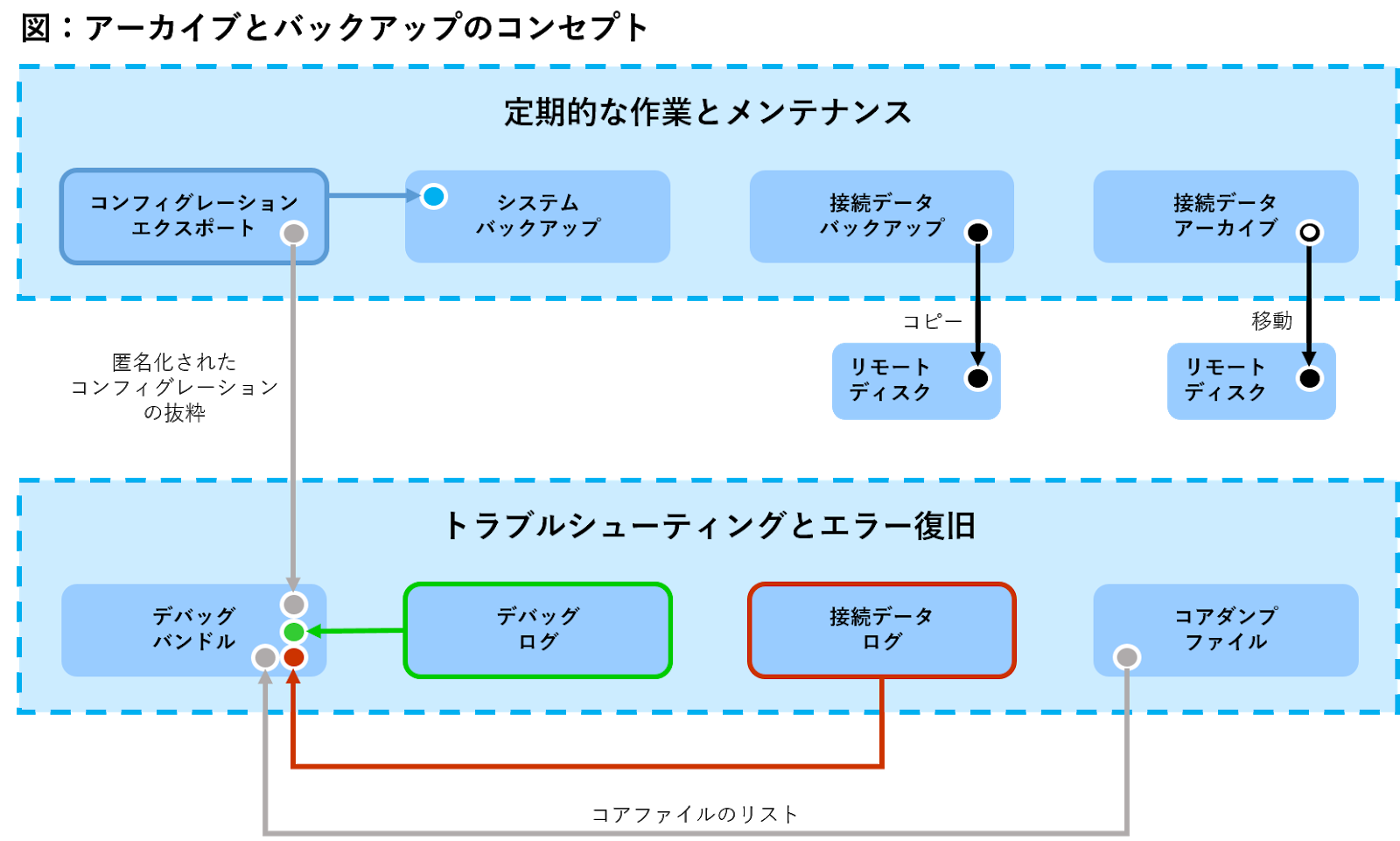 - システムバックアップ:データベースダンプ、システムレポートファイル、内部システム監視ツールの出力ファイル、およびコンフィグレーション 等