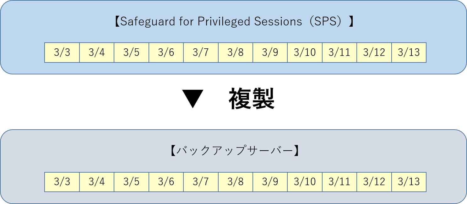 例えば、SPS に以下のように監査証跡が保存されている場合、バックアップが実行されると3/1~3/11までの監査証跡がバックアップサーバーに複製されます。