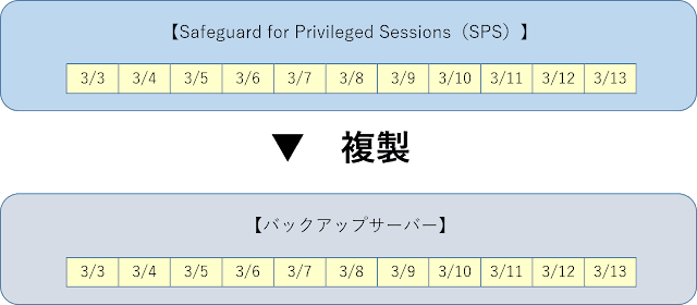 よくお客様からの質問で、「バックアップは世代管理しているのか?」と聞かれますが、SPS のバックアップは、その時点でのデータをバックアップサーバーに複製するのみになりますので、以前にバックアップしたデータはバックアップサーバーに保持されないことに注意してください。(下の例では、3/1と3/2の監査証跡データはバックアップサーバーに保存されません。)