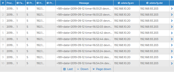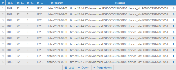 Ciscoスイッチログの受信と同じように、[Do not parse]を有効にします。以下のようにFortigateのsyslogメッセージ全体が[Message]カラムに入力されます。ただし、ファシリティ([Facility]カラム)とセベリティ([Priority]カラム)は、SSBによって任意の値が入力されます。