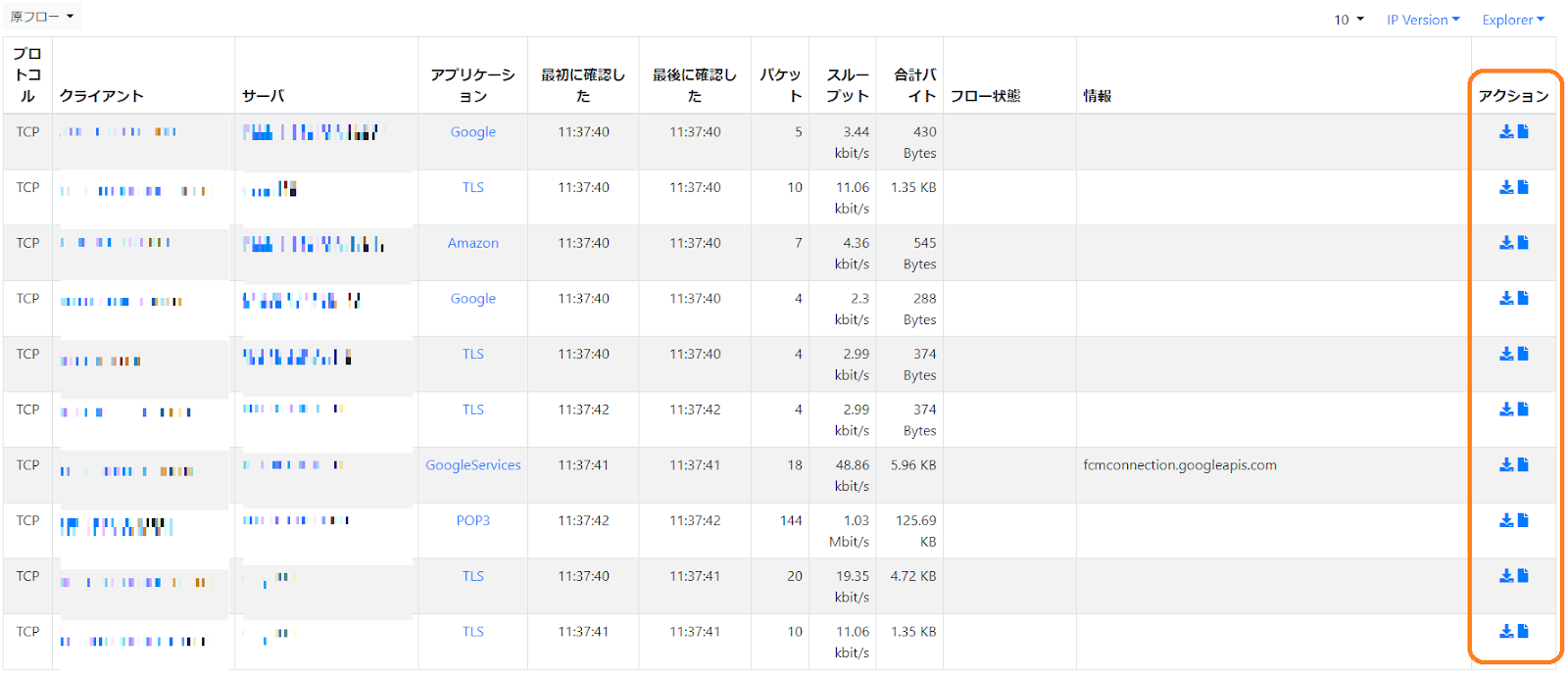上図はCS間のフロー情報を表示しています。さらに詳細を確認するにはアクション枠内のノートアイコンをクリックすれば、生データをテキスト形式でダウンロードすることができます。