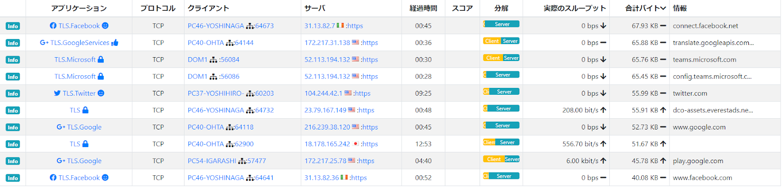 アプリ―ケーションが一覧化され、それぞれのトラフィック量や送受信者の詳細までドリルダウンで確認することができます。