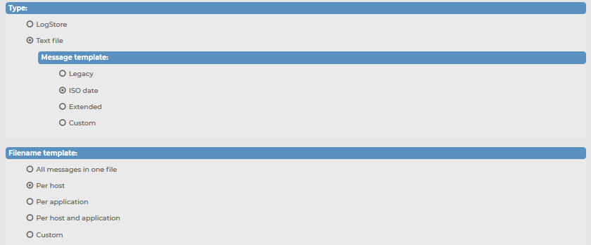 テキスト形式では、[Filename template]セクションで、保存ファイル名を指定することができます。”Custom”を選択すると、テンプレートを使用して任意のファイル名を設定できます。詳細については、「syslog-ng Premium Edition Administration Guide」(英文)を参照してください。