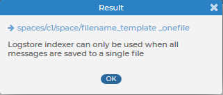 ※バイナリ形式では、[Filename template]セクションで、保存ファイル名を指定することができません。”All messages in one file”以外を指定した場合、以下のメッセージが出力され、コンフィグレーションは保存されません。