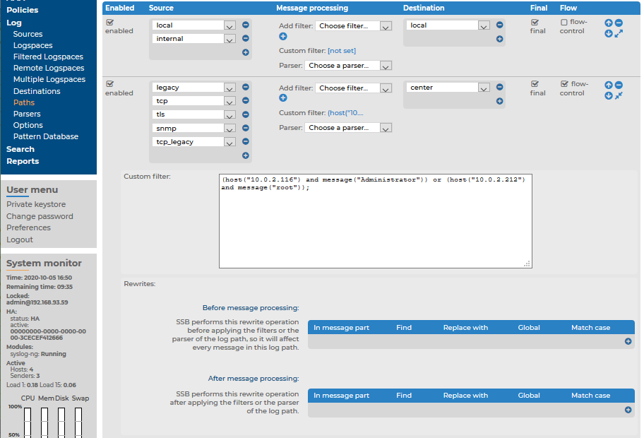 SSBで、ログをフィルターして保存(または転送)するには、ログパス([Log]>[Paths]ページ)の[Message processing]セクション以下で行います。