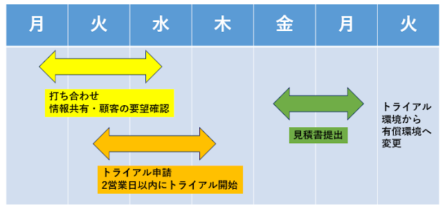 しかも、その日の内に設定・運用開始が可能。期間は短いですがトライアル対応ができ、そのユーザーのまま有償ライセンスへ移行することも可能です。
