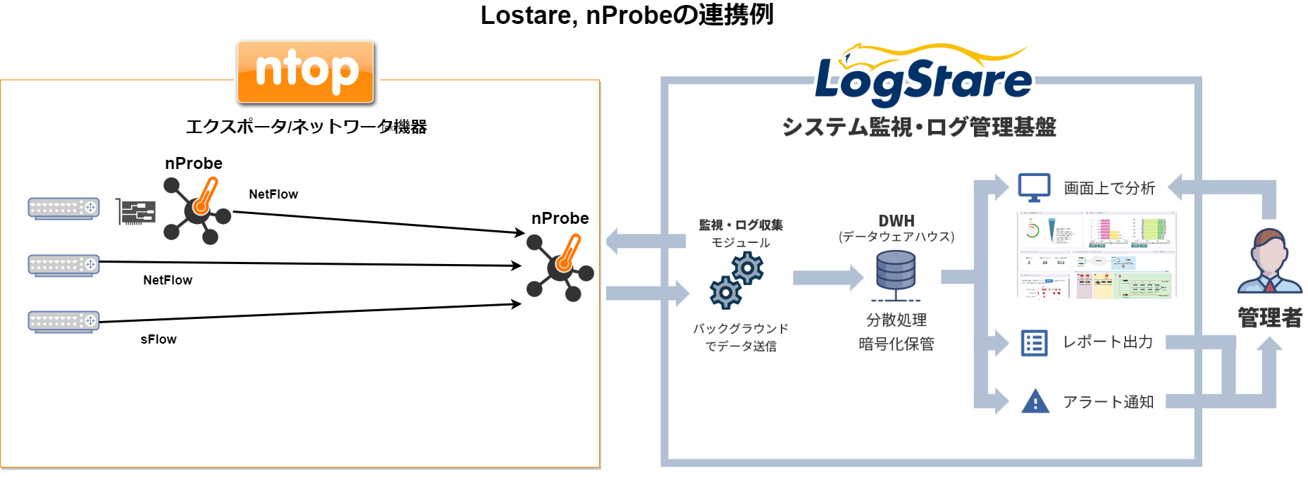 LogStareとnProbeが連携することによって、ファイアウォール等では収集の難しい内部サーバ間の通信やクラウド上のIaaSサーバ上に流れる通信など、企業内のあらゆる通信を可視化することが可能となります。