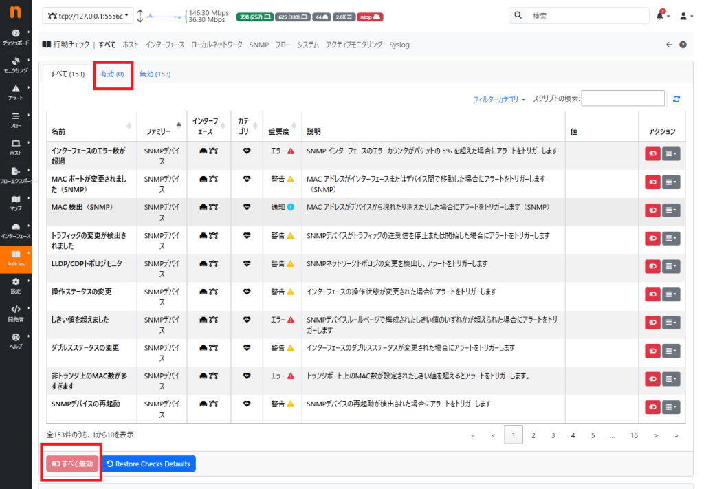 clickhouseは、2つのデータを保持します。①rawフローデータ(履歴画面で使用)、②アラート。clickhouseの負荷を下げるためには、この②アラートを無効化するといったやり方があります。ntopng画面左メニューの「Policies」→「動作チェック」をクリックします。画面左しの「すべて無効」ボタンをクリックすれば、アラートが無効化(画面上部の有効のカウントが0になります)されます。